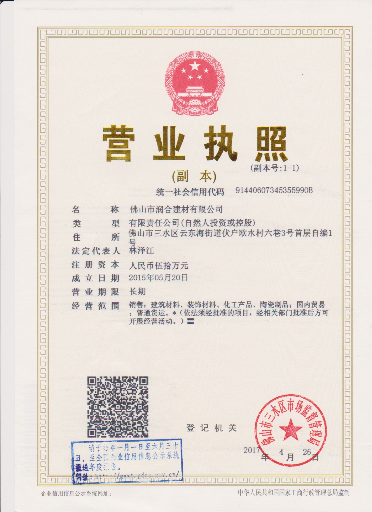 佛山市潤合建材有限公司成立于2015年5月,坐落于因北江、西江與綏江匯流而得名的廣東三水。創(chuàng)始人林澤江先生是一位典型的潮汕生意人,有著潮汕人不服輸不怕苦、